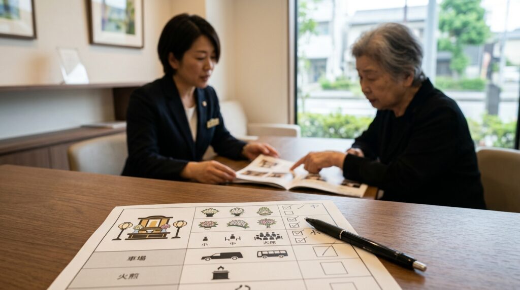 | 基本プランの範囲 | 寝台車・棺・骨壺・祭壇などの有無 | プラン外の必須項目がないか確認する |