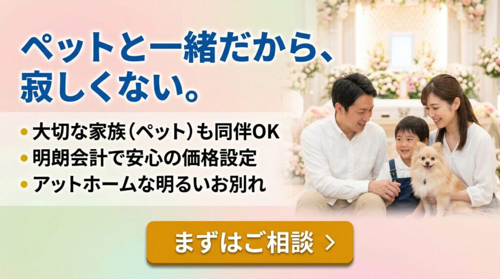 ペットと一緒に過ごせることで、特に長時間の通夜や夜間の滞在でも、家族の心の支えになりやすくなります。ペットを自宅に残す必要がなく、預け先の手配に追われる負担も軽減されます。吠え声やにおいなどのマナー面については、事前の相談や配慮が必要ですが、「どこまで一緒に過ごせるか」「どのスペースを利用できるか」など、具体的な過ごし方を打ち合わせで確認できます。
